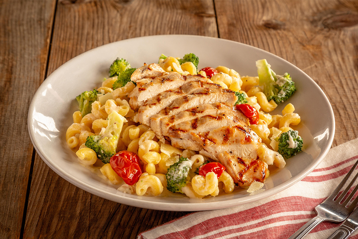 Sliced grilled chicken breast and broccoli over cavatappi in asiago cream sauce, topped with parmesan and seasoned cherry tomatoes.