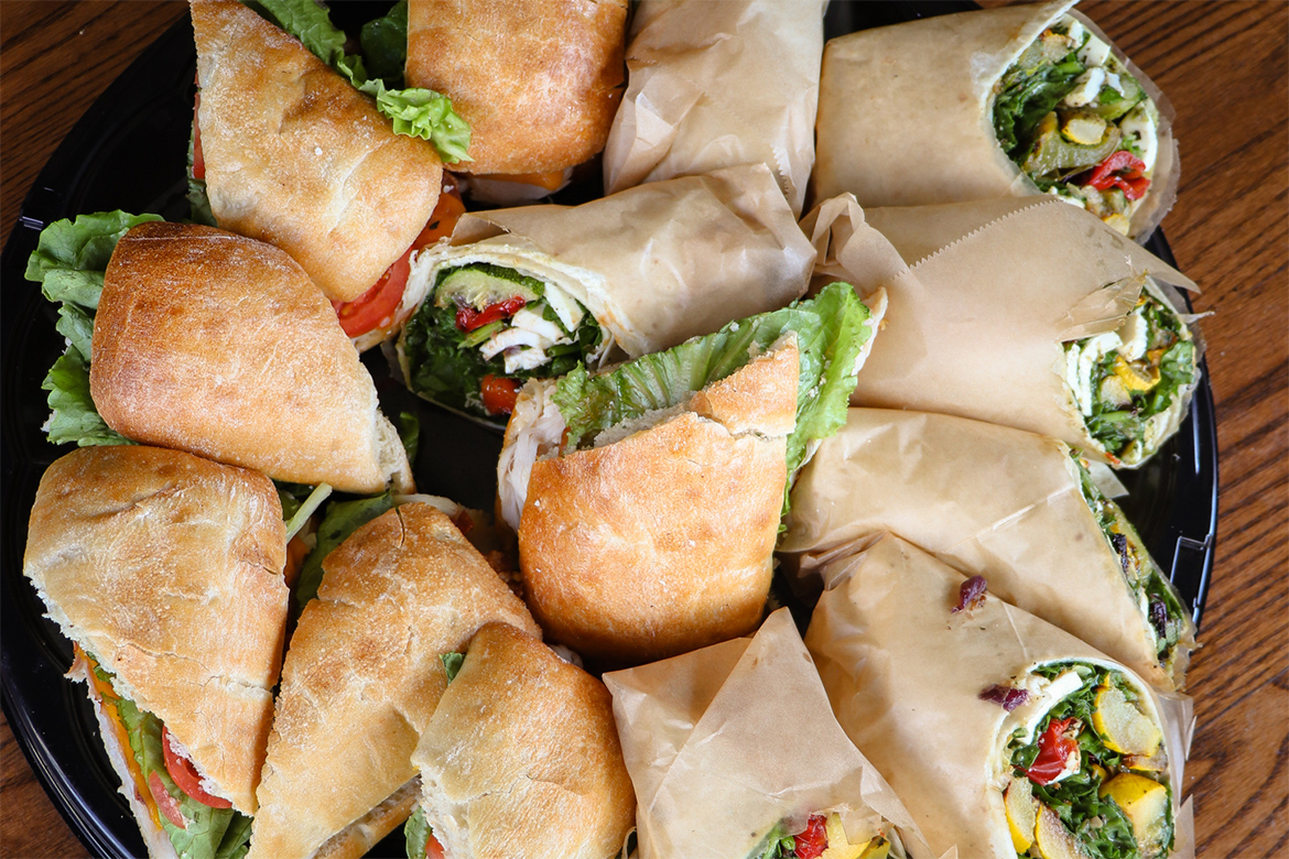 Combos include Caesar or house salad platter, chocolate-chip cookie or brownie platter and beverage (gallon of lemonade, iced tea, coffee or two 2- liter sodas). Serves 8-10.