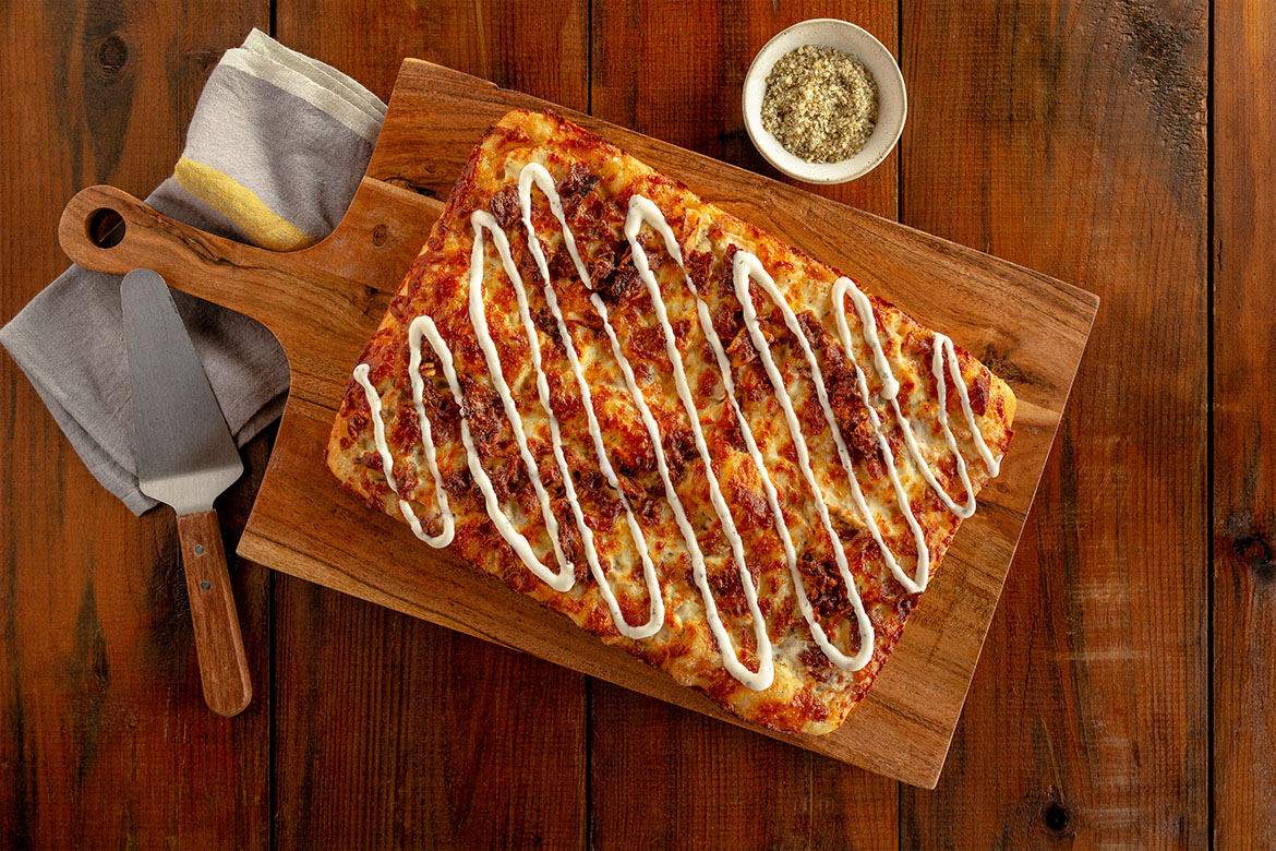 Aged white cheddar and mozzarella cheese blend, signature Detroit sauce, romano & oregano mix.