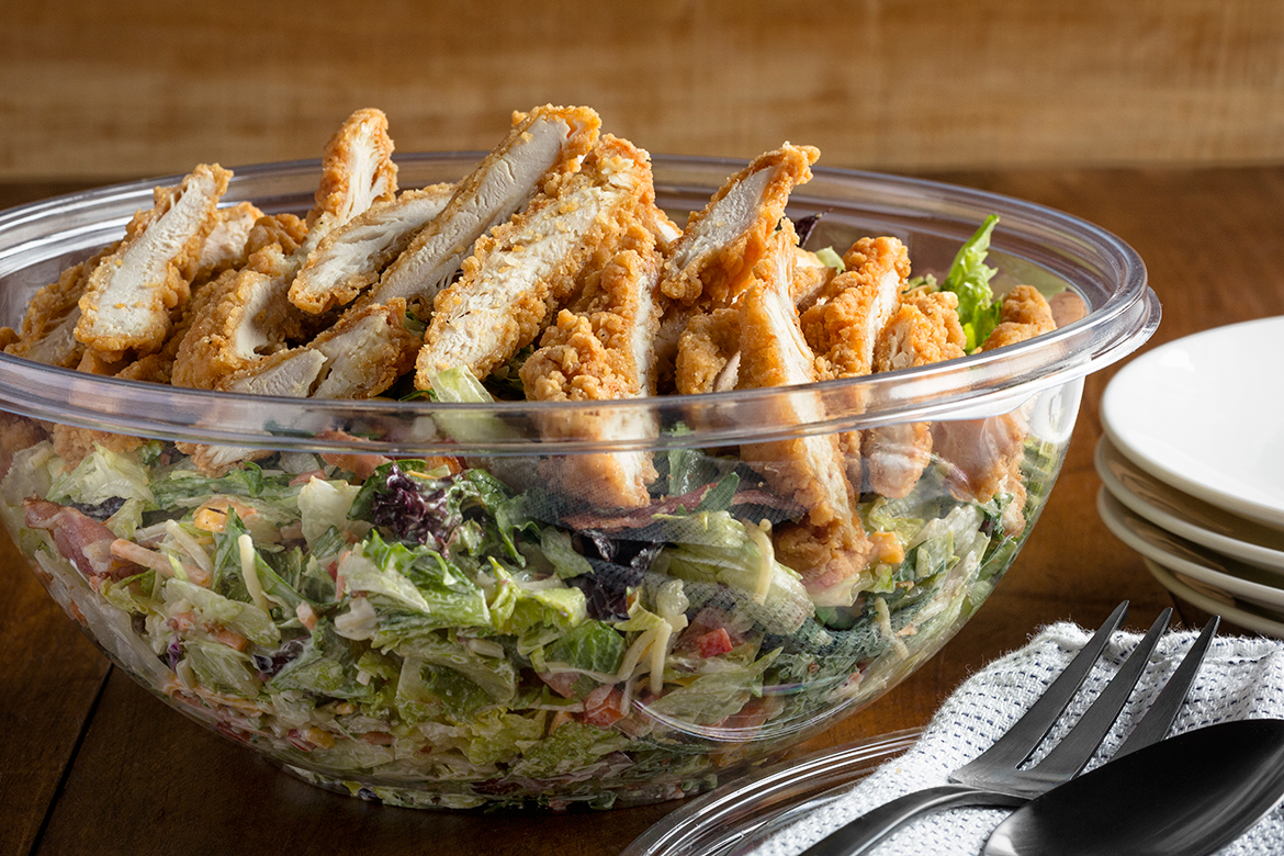 Fresh greens, chicken tenders, thin spaghetti, bacon, red peppers, tomatoes, cheddar, honey mustard dressing. Also available with grilled chicken.