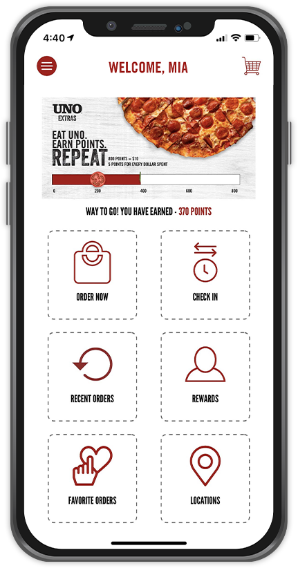 Every time you dine with us we’ll not only provide you with great food, but you’ll earn points along the way. It’s pretty simple: Eat UNOs, earn rewards. Sound like a good deal? Get started today and receive free individual pizza!*